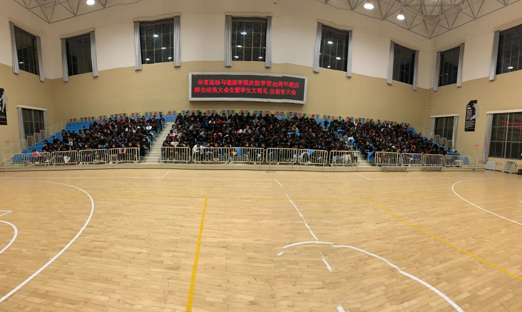 10月8日晚上7:30,KY开元集团官网在综合体育馆组织召开庆祝学校60周年校庆师生动员大会暨学生文明礼仪教育大会。体育学院领导班子成员、全体教职工及17级、18级、19级全体学生,共计600多人参加。会议由学院党总支副书记吴建全主持。
