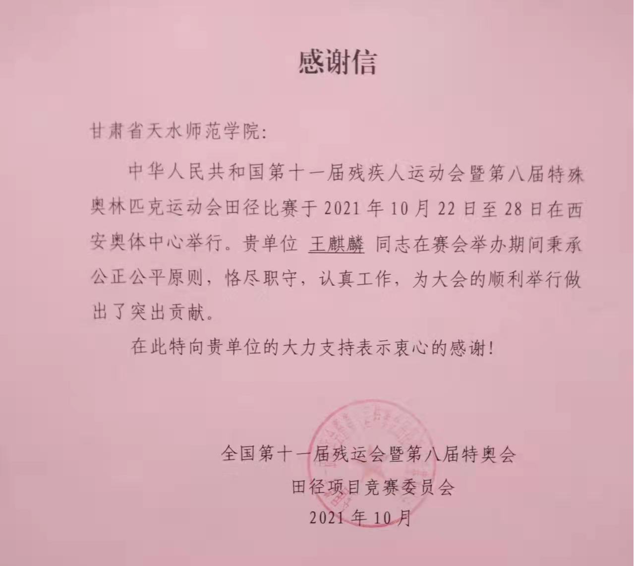 2021年10月22-28日,中华人民共和国第十一届残疾人运动会暨第八届特殊奥林匹克运动会田径比赛在西安奥体中心举行。开元官网特奥田径国家级裁判王麒麟教授受中残联和国家体育总局选派为田径项目技术官员,并担任田赛裁判长。