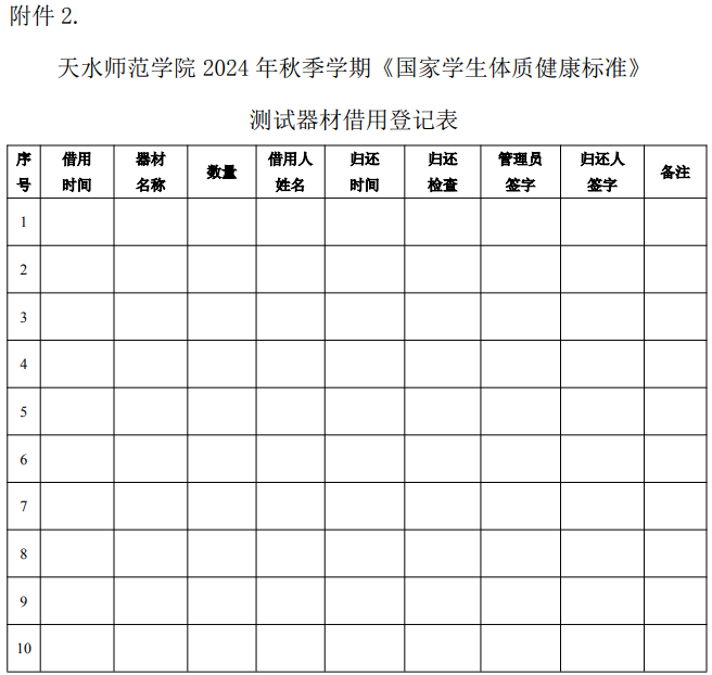 附件2.天水师范学院2024年秋季学期《国家学生体质健康标准》测试器材借用登记表