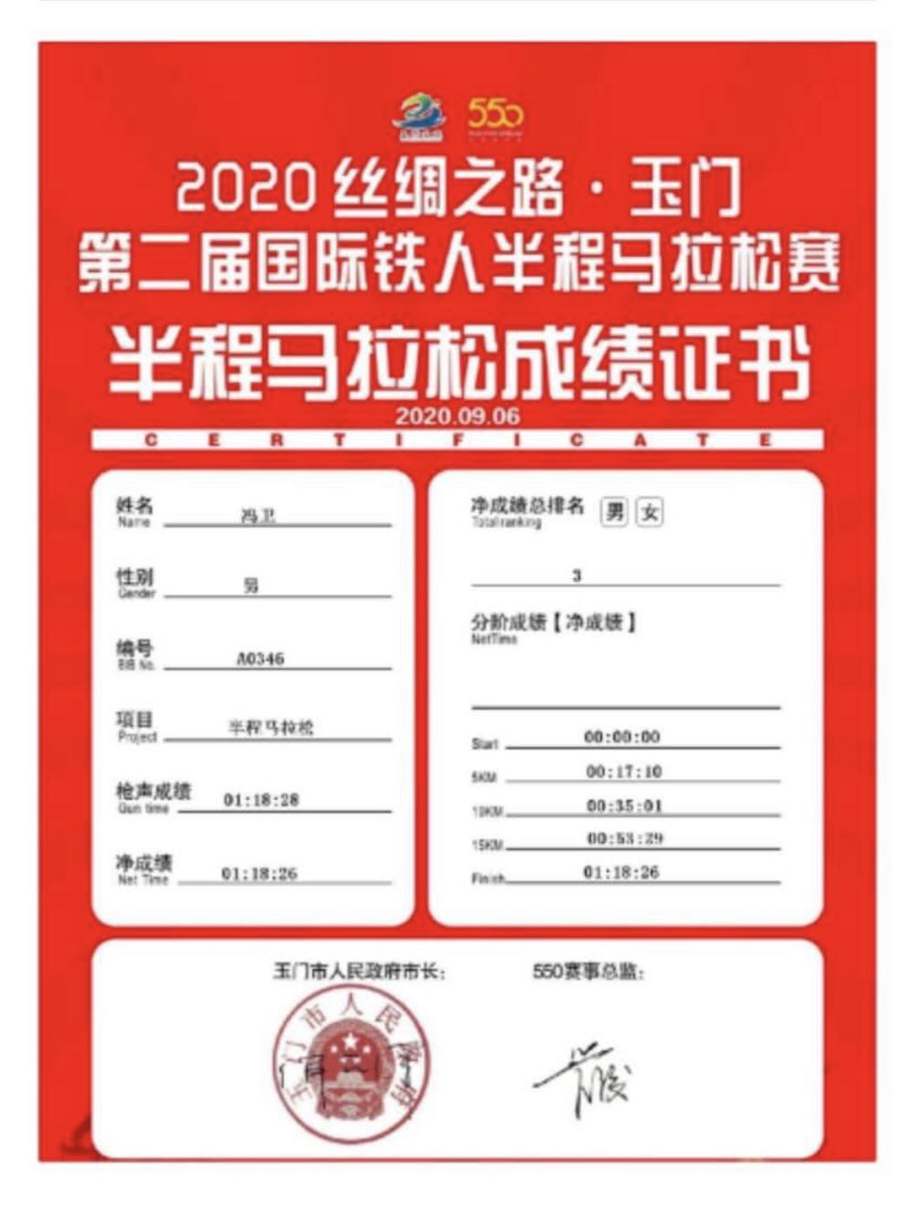 由甘肃省体育局、玉门市人民政府主办,玉门市文体广电和旅游局、玉门市体育中心、玉门市委直属机关工委承办,戈友文化传媒(上海)有限公司运营的2020丝绸之路.玉门第二届国际铁人半程马拉松赛于9月6日在玉门市政广场鸣枪开赛,有来自全国19个省份,60多个城市,共计5000名专业马拉松选手参加本次比赛,开元官网运动训练专业2018级冯卫同学,在比赛中不畏强手,最终以1小时18分26秒获得男子组第三名的好成绩,为开元官网争得了荣誉!